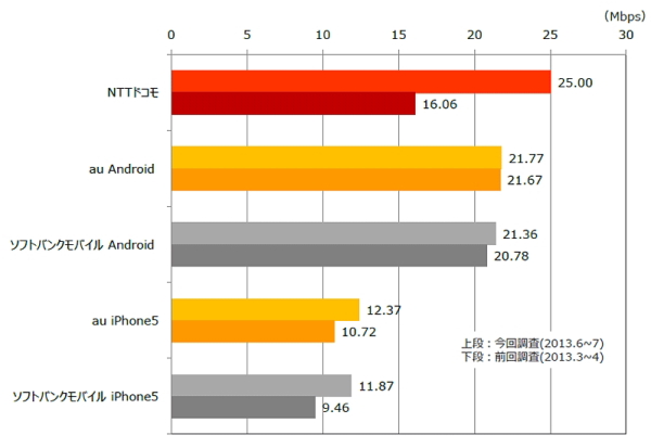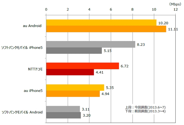 ダウンロードとアップロードに関しては、ドコモの「Xperia A」が25.00Mbps(前回16.06Mbps※機種は「Xperia Z」)でダウンロード1位。KDDI(au)の「HTC J One」が10.20Mbps(前回11.11Mbps※機種は「HTC J butterfly」)でアップロード1位となっている。