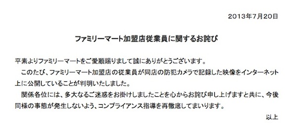 ファミリーマートのアルバイト店員が2013年7月20日(土)に「サッカー日本代表・香川真司選手が来店した」として防犯カメラの画像をTwitterに投稿した問題で、同社が謝罪文を発表した。