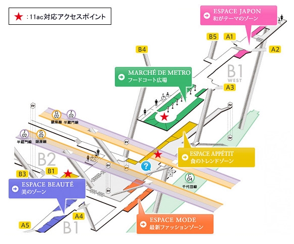 同発表によると、アクセスポイントを表参道駅構内の駅チカ商業施設「Echika表参道」内の「MARCHÉ DE METRO(フードコート広場)」や「ESPACE APPÉTIT(食のトレンドゾーン)」付近など計3か所に設置する。通信速度はスマートフォン・タブレットで最大433Mbps、パソコンなどでは最大1.3Gbpになるという。