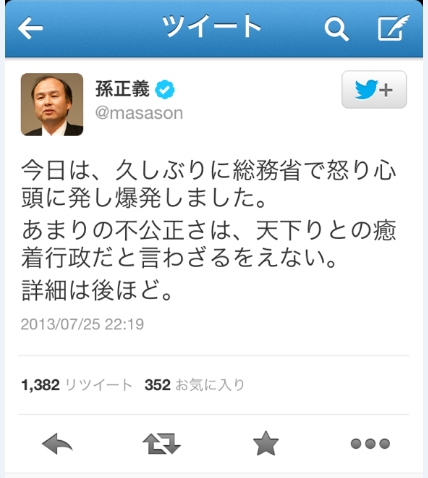 ソフトバンクモバイル株式会社の代表取締役社長 兼 CEOの孫正義氏が、自身のTwitterにツイートを投稿し、総務省の対応に対して怒りを露わにしている。