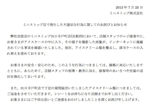 写真は店舗スタッフがレジ接客中に、客がアイスケースの中に入りそのようすを撮影、Twitterに投稿したもので、インターネット上で騒ぎとなっていた。同社では、該当店舗のアイスクリーム類を撤去し、アイス冷蔵ケースの入れ替えを進めているという。また、2013年7月23日(火)22:00〜7月25日(木)12:00の間に販売したアイスクリーム類については返金するとしている。