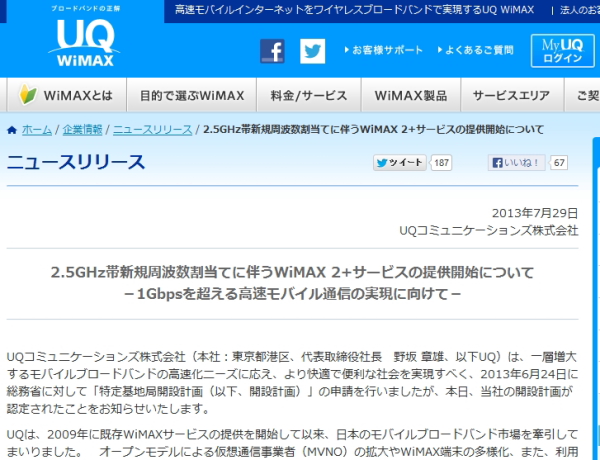 UQ、2.5GHz帯新規周波数の割当獲得でより高速な通信サービス「WiMAX 2+」を提供へ