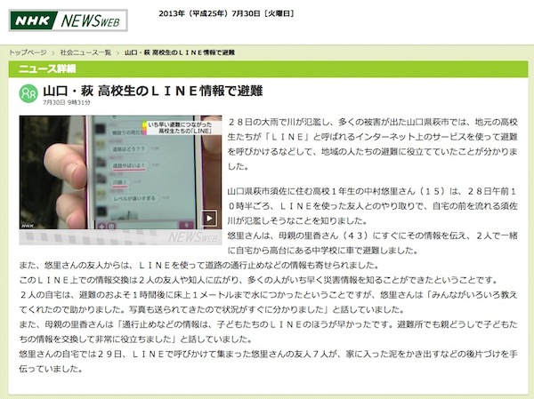 NHKニュースは、2013年7月28日の大雨で川が氾濫し多くの被害が出た山口県萩市で、地元の高校生がLINEで避難を呼びかけるなどして、地域住民の避難に役立てていたと報じた。