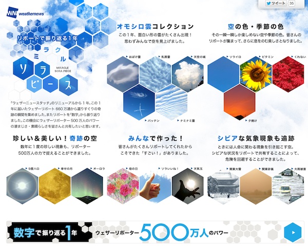 この1年で届いたウェザーリポートは総計660万通。その中で希少な空や雲の瞬間を集めた「ミラクルソラピース」のほか、この1年を振り返るウェザーリポートのインフォグラフィックスも公開。この1年に届いた空や雲の写真を楽しむことが可能だ。