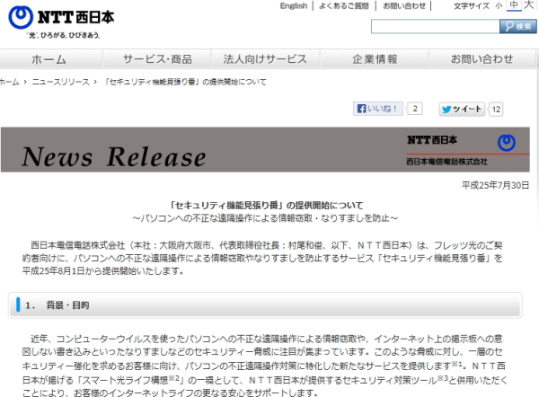 NTT西、パソコンの遠隔操作による情報窃取を防止する「セキュリティ機能見張り番」