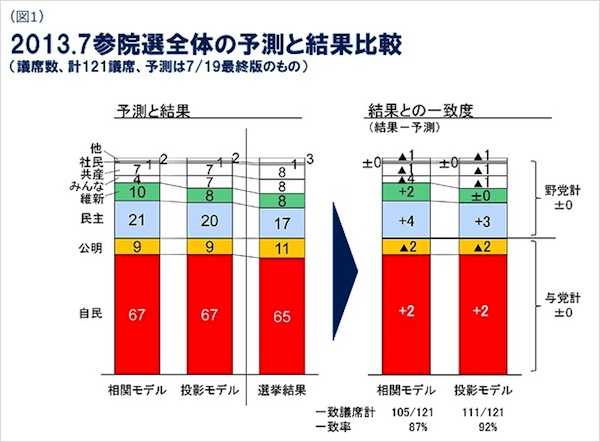 同レポートは、「予測の的中率や差異の検証」「山本太郎氏の検索推移の分析」で構成。「予測の的中率や差異の検証」においては、与野党それぞれの合計議席について予測数値と実際の獲得議席数を比較すると与党76議席・野党45議席となり、「相関モデル」「投影モデル」ともに完全に一致する結果だという。しかし、政党・比例区・選挙区別で比較すると改選対象となった全121議席中、「相関モデル」では105議席(87%)、「投影モデル」では111議席(92%)と細かい差異があったため原因を検証した。