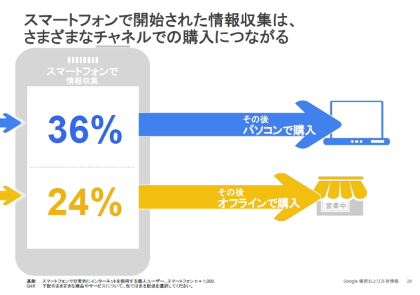 商品購入に関しても、81%が商品やサービス情報を収集すると答えている。スマートフォンで情報収集してから、その後、パソコンもしくはオフラインで購入するというスタイルが確立されつつあることがわかった。