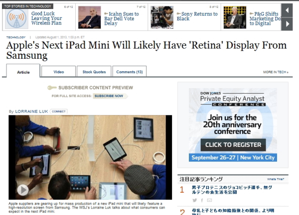 米WALL STREET JOURNALは1日(米国時間)、米AppleのタブレットiPad miniが高解像度のRetinaディスプレイを搭載し、10~12月期には大量生産体制に入るのではないかと報道した。