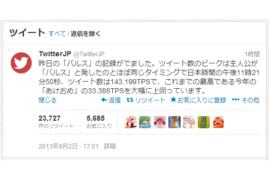 発表によると、ツイート数のピークは主人公が「バルス」と発したのとほぼ同じタイミングとなる23時21分50秒。ツイート数は14万3199TPSで、これまでの最高である今年の「あけおめ」の3万3388TPSを4倍以上も上回る結果となった。