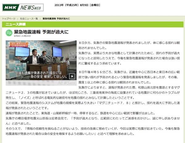 NHKニュースによると、2013年8月8日16時56分ごろ、緊急地震速報が発表されたが体感できる揺れを感じなかったことについて気象庁は、「実際より大きな地震として計算されたために、揺れの予測が過大になった」と説明している。