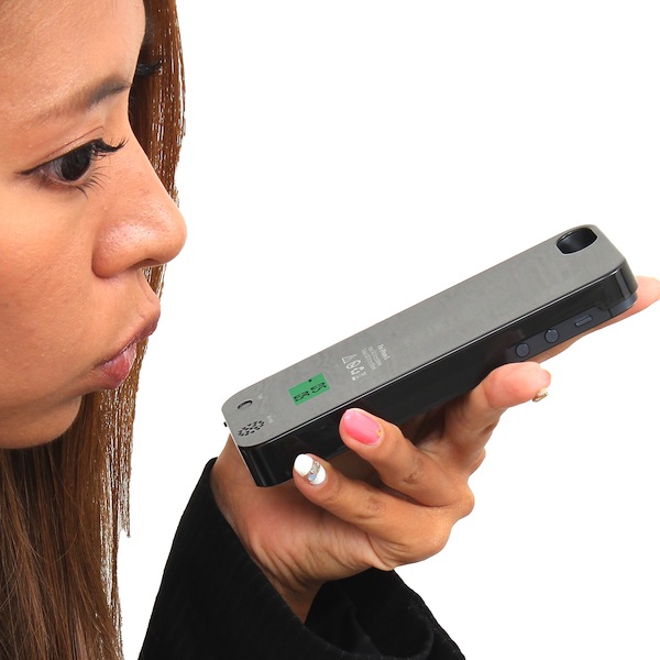 同製品は、アルコールチェッカーを内蔵したiPhone5用バッテリーケース。ケース背面のアルコールチェックボタンを押して、アルコールテストホールに約3〜5秒、息を吹きかけるだけで測定が可能だ。電源はバッテリーケースを使用しているため、別途電池が不要。測定結果はデジタル数値で表示し、数値に応じて緑(正常)・ 黄(注意)・赤(危険)の3カラーのLEDバックライトが点灯してくれるので、酔っぱらって数字がわからない状況でもカラーを見ればひと目で確認できる。