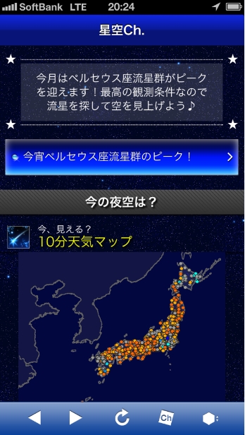 ウェザーニューズでは、全国の観測状態を予測する「流星見えるかなマップ」をサイト内に開設。12日19時半現在では、関東、北海道、沖縄の一部を除くエリアが“バッチリ見えると”の予報が出ている。関東などでも、雲の切れ間からの観測が可能としている。現在、サイトは「ペルセウス座流星群2013」特設サイト になっている。