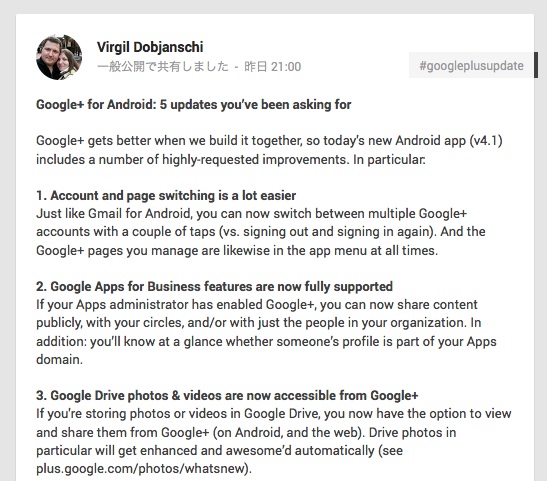 このほか、複数アカウントを使用している場合の切り替えがよりスムーズに。ビジネス向けGoogle Appsのフルサポート化、Google Drive内の写真や動画をGoogle+でシェアできるようになった。