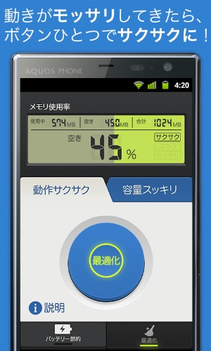 「動きがもっさりする」「タップへの反応が悪い」などの動作改善に関しては、不要な起動アプリを終了させたり、メモリを最適化することで、スマホの動きを快適化できる。また、「容量スッキリ」機能では、大容量のアプリを確認して、不要ならば削除することができる。
