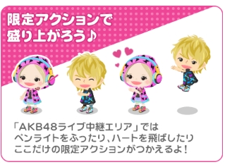 生中継は、アメーバピグ内の映像配信エリア「ピグチャンネル」に「AKB48ライブ中継エリア」をオープンして行われる。日程は、8月27日19時~が“ともちん”こと板野友美の卒業公演、8月28日18時30分~が秋元才加の卒業公演となっている。エリア内では、ジャンプやペンライトを振る、ハートを飛ばすなどの4種類の限定ライブ応援用アクションがピグできるので、利用者同士で盛り上がれるとしている。
