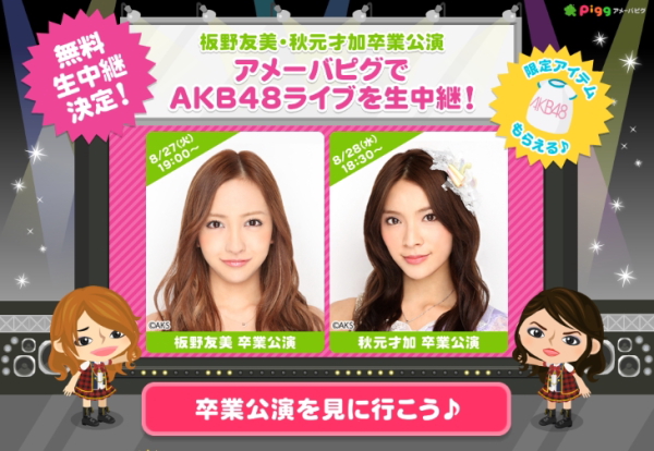 アメーバピグ、AKB48板野友美と秋元才加の卒業公演を無料生中継