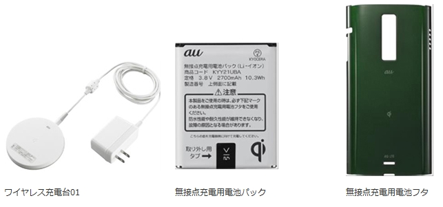KDDI株式会社と沖縄セルラー電話株式会社は28日、京セラ株式会社製のAndroidスマートフォン「URBANO L01」(アルバーノ L01)専用となる、「ワイヤレス充電台01」「無接点充電用電池パック」「無接点充電用電池フタ」を9月6日から発売すると発表した。価格は「ワイヤレス充電台01」が3675円、「無接点充電用電池パック」が5617円、「無接点充電用電池フタ」が1155円。