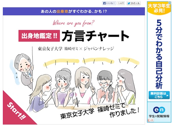 東京女子大学篠崎晃一教授のゼミ生11人が開発した「出身地鑑定!! 方言チャート」が「意外と当たる!」と話題になっている。
