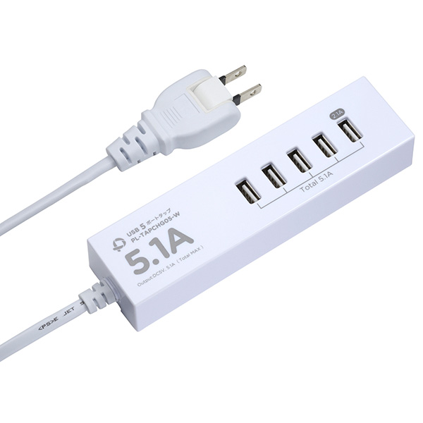 本製品は、家庭用コンセントからの入力/5ポート合計で5.1Aの出力が可能。5基のUSBポートのうち1ポートは2.1A出力をサポートしており、急速充電に対応する。電源プラグ部は180度可動式で、埃などによる火災を防止するトラッキング防止タイプ。ケーブルと突起部を除く本体サイズは約152(幅)×25.5(高さ)×40.5(奥行)mm、重量は約240gで、ケーブル長は約120cmとなっている。