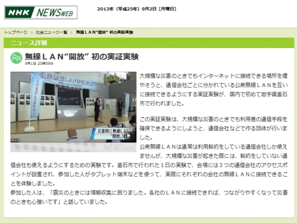 株式会社エヌ・ティ・ティ・ドコモ(docomo)、KDDI株式会社、ソフトバンクモバイル株式会社などによる団体「無線LANビジネス推進連絡会」は1日、大規模災害時の公衆無線LANサービス開放のために、「公衆無線LAN実証実験」を宮城県・釜石市のシープラザ釜石で行った。