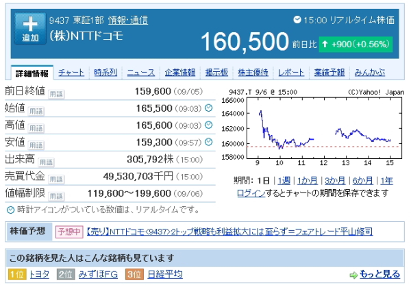 この発表では、「iPhoneを発売するとの報道は自社から出たものではない」とし、「ドコモからの発売は無い」というような完全否定のニュアンスではなかった。それに加え、NHKや日本経済新聞での“決定済み”という報道を受けて、ドコモの株価は上昇した(前日比+0.56%※15時時点)。そして、そのあおりをうける形でKDDI(前日比-0.20%※15時時点)やソフトバンク(前日比-2.15%※15時時点)の株価が下落した。