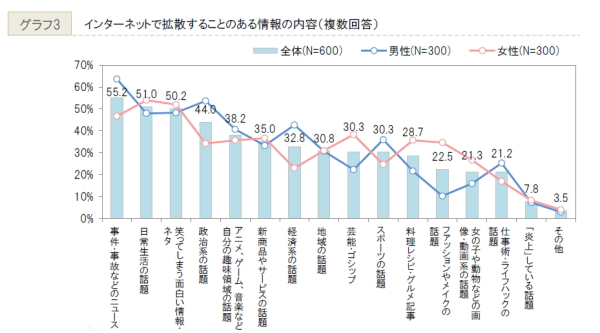 また、「インターネットで拡散する話題の内容は」という質問に対しては、「事件・事故」が55.2%で1位となり、2位は51.0%で「日常生活の話題」、3位は50.2%で「笑えるネタ」となった。最近の事例では、9月2日・4日に起こった竜巻は「事件・事故」として多くの人が情報拡散を行った。また、コンビニのアイス冷凍庫に入るなどの不適切写真投稿は、身内が「笑えるネタ」として拡散したところ、多くの人の目に触れることとなり問題となることが多い。