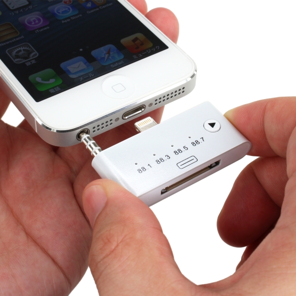 本製品は、iPhone5/iPod Touch内の音楽をFM周波数で飛ばして、FMラジオで聞けるようにするFMトランスミッター。機器とはLightning端子と3.5mmステレオミニプラグで接続し、電源は機器のバッテリーを使用する。利用可能な周波数は88.1、88.3、88.5、88.7の4つ。