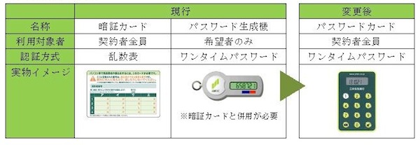 また、暗証カードの新規発行は停止するほか、すでに契約している既存の顧客についても「パスワードカード」への切り替えを積極的に推奨し、現行の認証方式は一定期間経過後に廃止する予定だとしている。