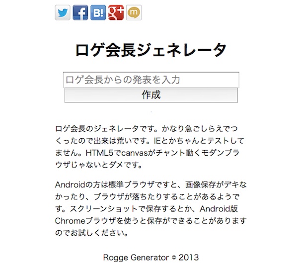 ロゲ会長ジェネレータは、好きな言葉を入力すると、ロゲ会長がもつ白いパネルにそれが表示され、あたかも「発表」されているかのような画像になるもので、NAVERまとめにはさまざまな「発表」が集まっている。