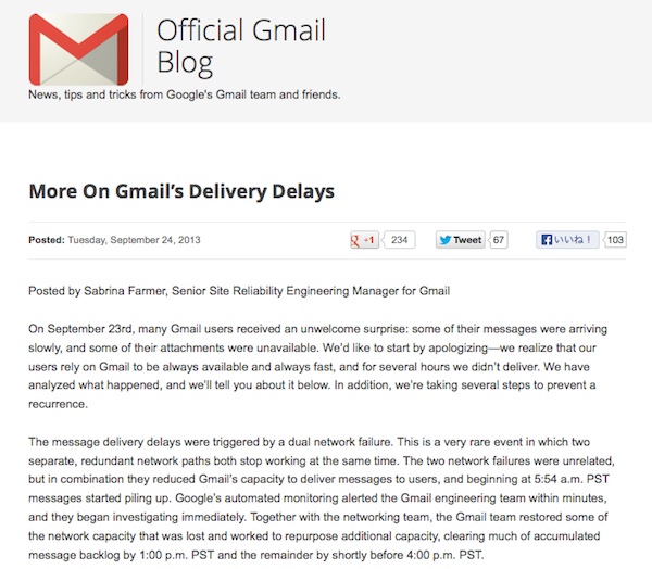 Googleは、9月24日に発生した数時間にわたるGmailのメッセージ配信の遅延について公式ブログで謝罪、原因と対策について発表した。