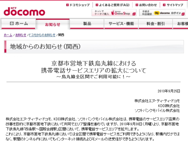 株式会社エヌ・ティ・ティ・ドコモ(docomo)、KDDI株式会社、ソフトバンクモバイル株式会社は25日、京都市営地下鉄烏丸線の「四条~国際会館駅」間で携帯電話サービス(インターネット接続・Eメール送受信)を開始すると発表した。サービスは9月30日から開始される。