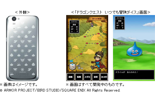 また、両社は「ドラゴンクエスト」とコラボレーションしたスマートフォンも開発すると発表した。同製品は「ドラゴンクエスト」シリーズに登場するメタルスライムをモチーフにした高級感のあるボディで、同機種限定アプリ「ドラゴンクエスト いつでも冒険ダイス」をプリインストールする。