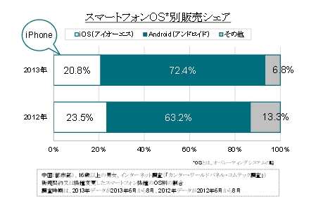 また、新規契約もしくは機種変更を行ったスマートフォンについて、中国の都市部の消費者に聞いたところ、iPhoneが20.8%、Android端末が72.4%だった。前年同時期比でiPhoneの販売シェアを減らしており、iPhone5sやiPhone5cの投入でどれだけシェアを回復できたのかに注目が集まる。また、中国では通信キャリア最大手のチャイナ・モバイル(中国移動)がiPhoneの取り扱いを開始するという噂が根強く、実現すればシェアの割合にも大きな変化が生じると見られる。