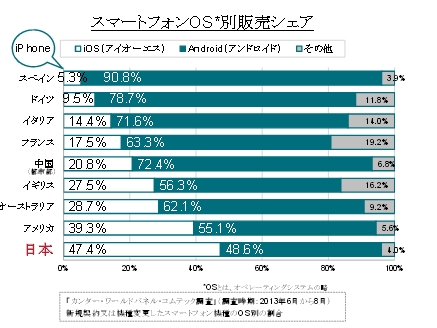 日本を含む9か国のスマートフォンOS別販売シェアを見てみると、iPhoneを販売するAppleのお膝元であるアメリカを抜き、日本がiOSのシェアで47.4%を記録してトップに立っている。Androidの割合が90.8%を記録したスペインとはユーザーの好みに大きな違いがあることがわかる。また、Androidと比較すると、日本ではiOSがわずかに少ない結果だったが、9月20日に発売されたiPhone5sに乗り換えたユーザーは少なくなく、現在はかなり拮抗しているか、iOSのシェアが上回っていることもあり得る。