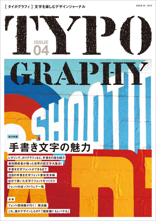 同誌は、国内外のタイポグラフィ情報やデザインワークに役立つ知識を紹介する専門媒体。04号は「手書き文字の魅力」特集で、カリグラフィー、レタリング、パッケージの筆文字、アメリカンスタイルのレタリング、看板文字、相撲文字など、手書き文字の書き手を訪ね、その書き方を取材したほか、書体関係者が世界の街角で撮影した手書き文字も紹介。手書き系フォント100書体の書体見本、自分で書いた文字をフォントにする方法の紹介など、一冊まるごと手書き文字を堪能できる内容だ。