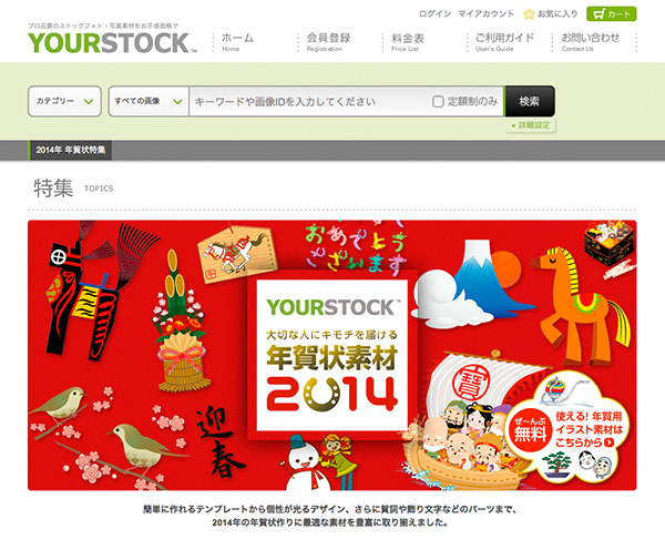 さらに「年賀状素材2014」の特集ページでは、YOURSTOCK会員限定で使用できる無料ダウンロード素材も公開。ハガキのテンプレートや挿絵/賀詞など、計48点のイラスト素材が用意されている。無料ダウンロードした素材は私用・商用を問わず、使用許諾の範囲内で自由に用いることが可能。なお、掲載されている無料コンテンツの内容は、随時入れ替えや追加も行われる予定となっている。