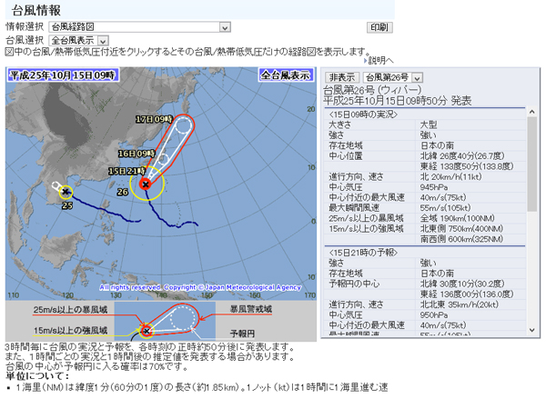 大型で非常に強い台風26号が接近、16日の朝にかけてピーク
