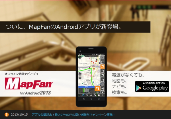 インクリメントP株式会社は15日、Android搭載端末向けのオフライン地図ナビゲーションアプリ「MapFan for Android 2013」を公開したと発表した。Google Playでダウンロードでき、通常価格は3780円。なお、現在は特別価格100円で提供され、時間の経過とともに通常価格へと増額されるという。