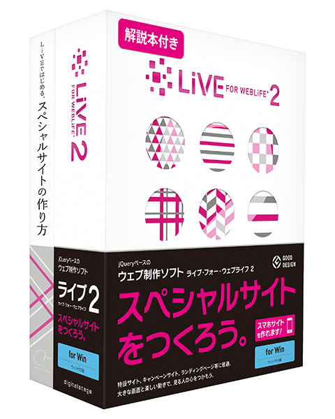 株式会社デジタルステージは、jQueryベースのWebサイトをスクリプト記述なしに作成できるソフト「LiVE for WebLiFE* 2」に、公式ガイドブック「LiVEではじめる、スペシャルサイトの作り方」(発行:メディアライフ・パブリッシング)を同梱したパッケージ製品を11月8日に発売する。Windows版とMac版が用意されており、標準価格は各2万800円で、10月28日より予約受付開始予定。