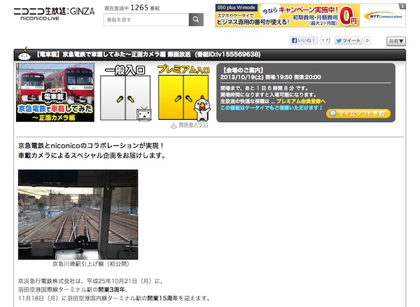 株式会社ドワンゴおよび株式会社ニワンゴが運営する動画サービス「niconico」において、2013年10月19日(土)に京浜急行電鉄株式会社とのコラボレーション企画「【電車載】京急電鉄で車載してみた」をニコニコ生放送で放送すると発表した。