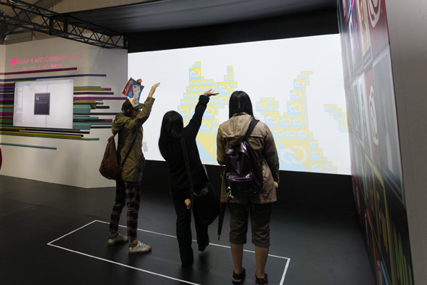 「Make it with Creative Cloud. 新しいスキルで新しい表現力を」のキャッチフレーズで、学生の目線に立ったキャンペーンを展開しているアドビブース。展示の目玉は、自分の身体の動作と連動して、スクリーン上にモーショングラフィックスが生成されるインスタレーション展示だ。