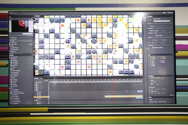 この展示は、今夏に東京および京都で開催した学生向けセミナー「Adobeぬけがけ2days」の参加者がつくったモーショングラフィックスを、プロの映像クリエイター集団「WOW」がインスタレーション化したコラボ作品。学生たちは2日間のセミナーを通じ、プロの講師の指導で映像編集ツールAfter Effectsなどの使い方を習得。月額料金で同社のすべてのクリエイティブ製品が利用できる「Adobe Creative Cloud」(以下、Adobe CC)を体験した。