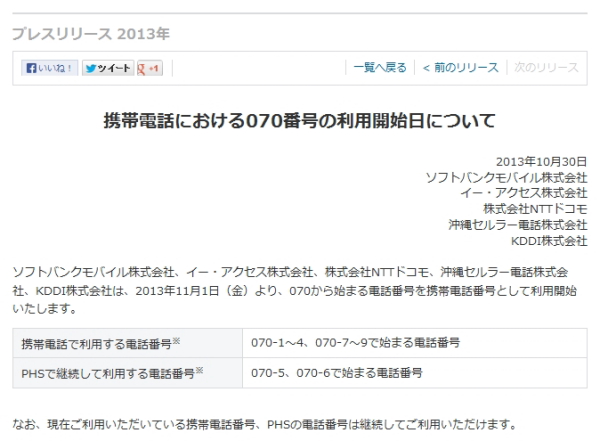 ソフトバンクモバイル株式会社、株式会社エヌ・ティ・ティ・ドコモ(docomo)、KDDI株式会社・沖縄セルラー電話株式会社(au)、イー・アクセス株式会社は30日、「070」から始まる電話番号を、携帯電話でも利用できるようにすると発表した。11月1日から利用開始となる。