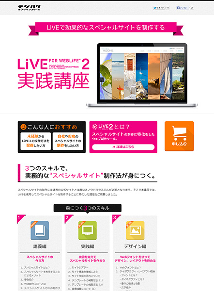 「LiVE for WebLiFE* 2 実践講座」では、通常の公式Webサイトとは異なるノウハウやスキルが必要な“スペシャルサイト”の制作力を身に付けることが可能。「効率的なスペシャルサイトの作り方」と題した講義編、「機能を覚えてスペシャルサイトを作ろう」と題した実践編、「Webフォントを使ってデザイン、レイアウトを極める」と題したデザイン編と、3つの講座で構成されている。