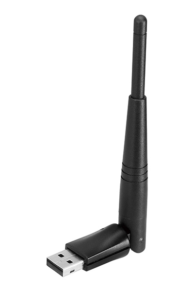 本製品は、上下左右に90度可動するハイパワーアンテナを搭載。使用場所に合わせて最適な角度にアンテナを調整し、受信感度を向上させることができる。暗号化機能では、WEP(64/128bit)、WPA-PSK(TKIP/AES)、WPA2-PSK(AES)に対応。本体サイズは約16(幅)×15(高さ)×152(奥行)mmで、重量は約12gとなっている。