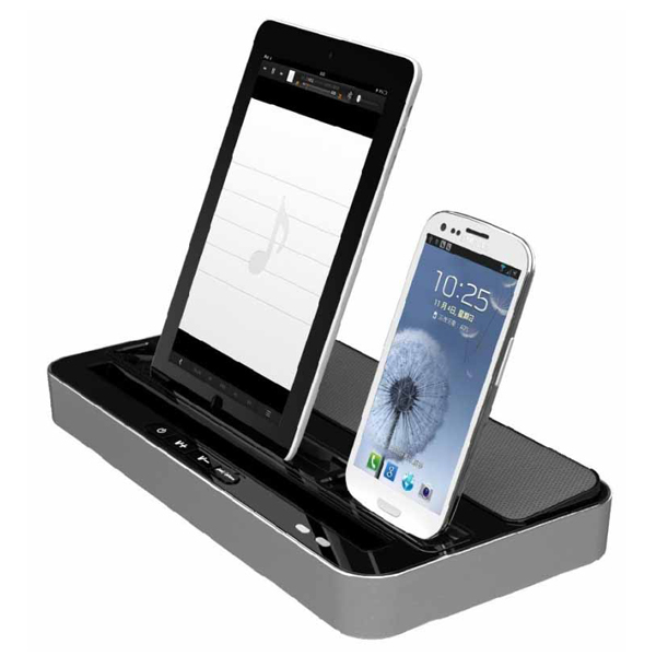 同製品は、iPhoneやAndroidスマートフォン、タブレットを並べて充電することが可能なドック。また、スピーカー機能も実装しており、動画視聴の際には内部スピーカーと比較し、迫力のある音を楽しめる。Dock接続の場合、そのまま音声が出力され、それ以外のコネクタで接続したい場合は、別途付属しているミニケーブルでイヤホンジャックと本体を接続しての出力となる。
