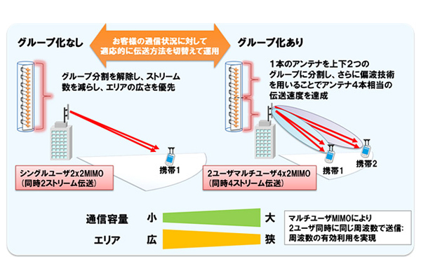 同技術は、受信状態の良い携帯電話には1本のアンテナを上下2つに分割し、偏波技術を用いることでアンテナ4本相当の伝送速度が実現できる。電波の受信状態の悪い携帯電話に対してはグループ分割を解除し、エリアの広さを優先して通信サービスを提供することができる。