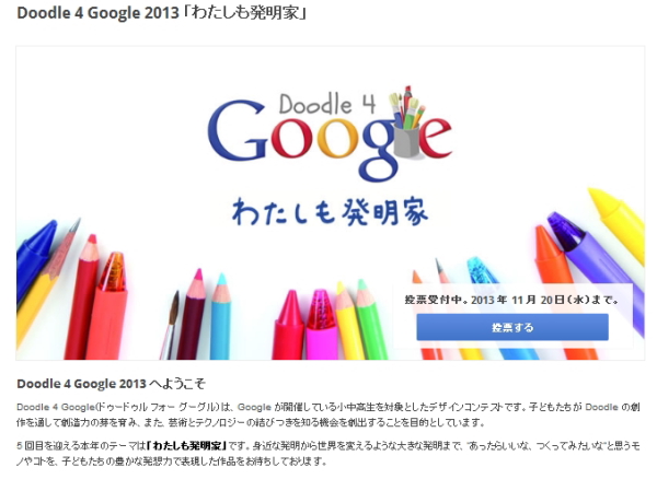 選考対象は小学校1~3年生、小学校4~6年生、中学校、高校の4部門の代表作品10点づつ、計40点。グランプリ作品は、Googleのトップページに1日掲載される。投票期間は11月20日まで。グランプリ発表は12月1日。