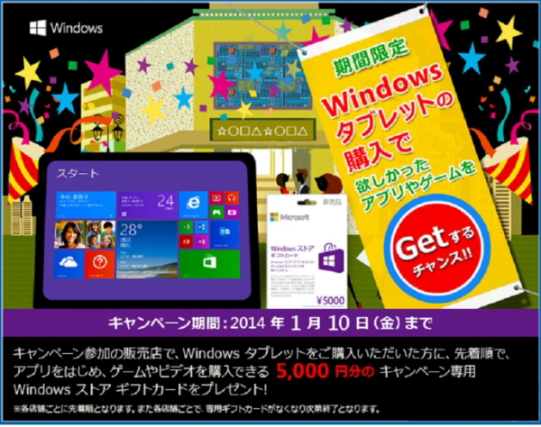 キャンペーンは、すでにWindows 8/8.1搭載のWindowsタブレットを利用しているユーザーや、これからWindowsタブレットを購入するユーザーが対象。その1としては「Windows ストア ギフトカード」をプレゼント。これは、キャンペーン参加の販売店で対象のWindows 8/8.1搭載のWindowsタブレットを購入すると、5000円分のキャンペーン専用「Windows ストア ギフトカード」が貰えるというもの。期間は11月15日~2014年1月10日まで(開始日は店舗により異なる)。