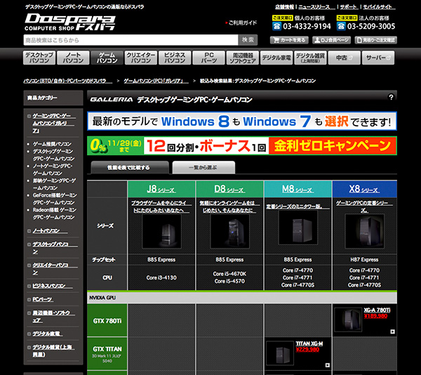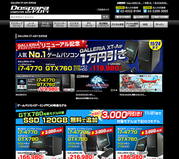 今回のWebリニューアルに伴い、全国のドスパラ各店舗およびドスパラ通販サイトでは、記念キャンペーンも開始された。「GALLERIA デスクトップモデル」のカスタマイズメニューであるSSDの追加や静音化/メモリ増設やCPU/電源のアップグレードなどを組み合わせた計17通りの指定カスタマイズパックを、通常時よりも最大で2万5000円オフの価格で利用することが可能。さらに、Core i7/GeForce GTX 760搭載のミドルタワー機「GALLERIA XT-A」が、通常より1万円オフの11万9980円で提供される。キャンペーン実施機関は2013年11月24日(日)注文分まで。